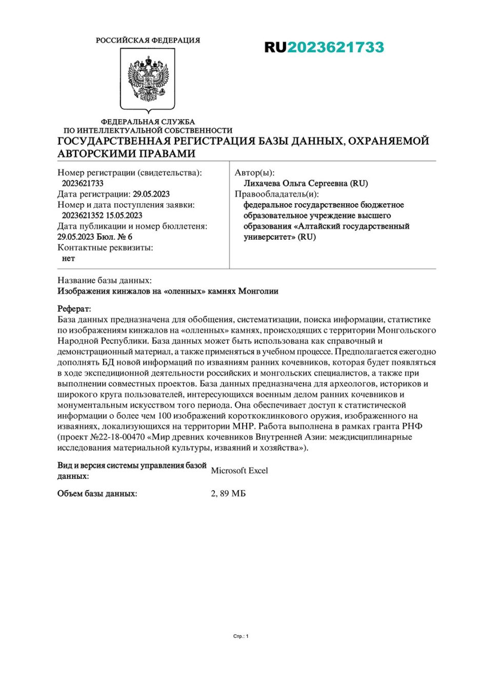 База данных предназначена для обобщения, систематизации, поиска информации, статистике по изображениям кинжалов на «оленных» камнях, происходящих с территории Монгольской Народной Республики. База данных может быть использована как справочный и демонстрационный материал, а также применяться в учебном процессе. Предполагается ежегодно дополнять БД новой информаций по изваяниям ранних кочевников, которая будет появляться в ходе экспедиционной деятельности российских и монгольских специалистов, а также при выполнении совместных проектов. База данных предназначена для археологов, историков и широкого круга пользователей, интересующихся военным делом ранних кочевников и монументальным искусством того периода. Она обеспечивает доступ к статистической информации о более чем 100 изображений короткого клинкового оружия, изображенного на изваяниях, локализующихся на территории МНР. Работа выполнена в рамках гранта РНФ (проект №22-18-00470 «Мир древних кочевников Внутренней Азии: междисциплинарные исследования материальной культуры, изваяний и хозяйства»).