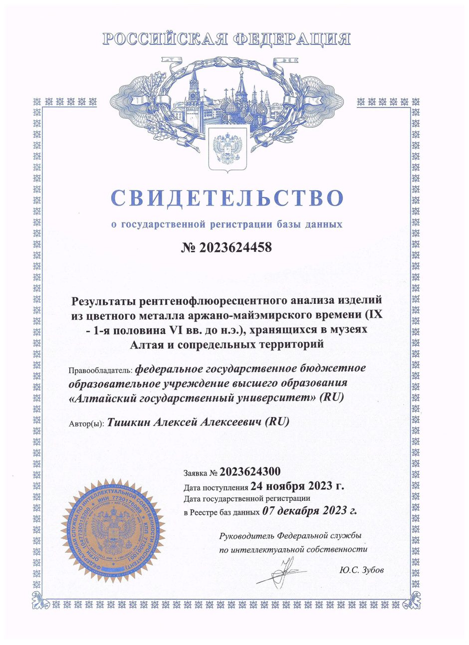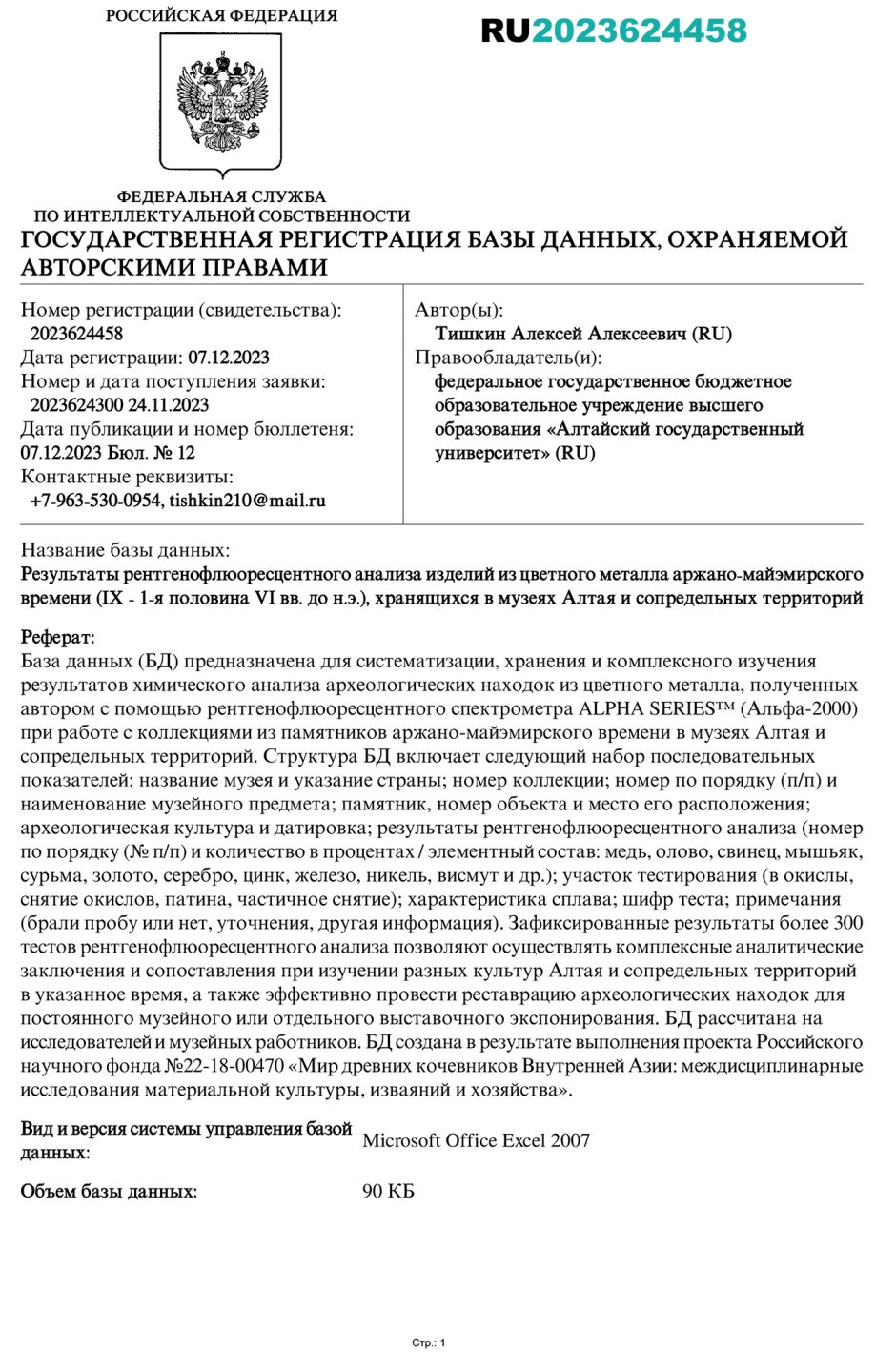 База данных (БД) предназначена для систематизации, хранения и комплексного изучения результатов химического анализа археологических находок из цветного металла, полученных автором с помощью рентгенофлюоресцентного спектрометра ALPHA SERIES™ (Альфа-2000)при работе с коллекциями из памятников аржано-майэмирского времени в музеях Алтая и сопредельных территорий. Структура БД включает следующий набор последовательных показателей: название музея и указание страны; номер коллекции; номер по порядку (п/п) и наименование музейного предмета; памятник, номер объекта и место его расположения; археологическая культура и датировка; результаты рентгенофлюоресцентного анализа (номер по порядку (№ п/п) и количество в процентах / элементный состав: медь, олово, свинец, мышьяк, сурьма, золото, серебро, цинк, железо, никель, висмут и др.); участок тестирования (в окислы, снятие окислов, патина, частичное снятие); характеристика сплава; шифр теста; примечания (брали пробу или нет, уточнения, другая информация). Зафиксированные результаты более 300 тестов рентгенофлюоресцентного анализа позволяют осуществлять комплексные аналитические заключения и сопоставления при изучении разных культур Алтая и сопредельных территорий в указанное время, а также эффективно провести реставрацию археологических находок для постоянного музейного или отдельного выставочного экспонирования. БД рассчитана на исследователей и музейных работников. БД создана в результате выполнения проекта Российского научного фонда №22-18-00470 «Мир древних кочевников Внутренней Азии: междисциплинарные исследования материальной культуры, изваяний и хозяйства».