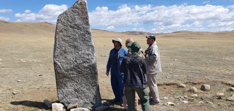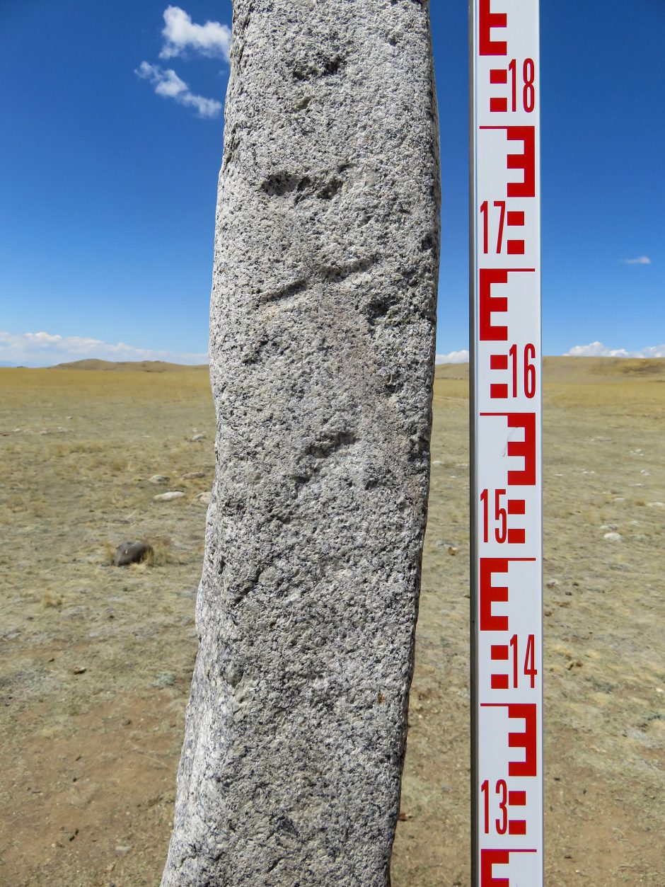 — «Оленные» камни — это стелы разной высоты (от 50 см до 5 м высотой), имеющие антропоморфный облик. Часто на них изображены атрибуты воинов – пояса и оружие (чекан, кинжал, лук, боевой топор, щит и др.). На многих таких обелисках выбиты летящие олени – отсюда и закрепилось название «оленные» камни, хотя были и другие обозначения, — рассказал Алексей Тишкин.