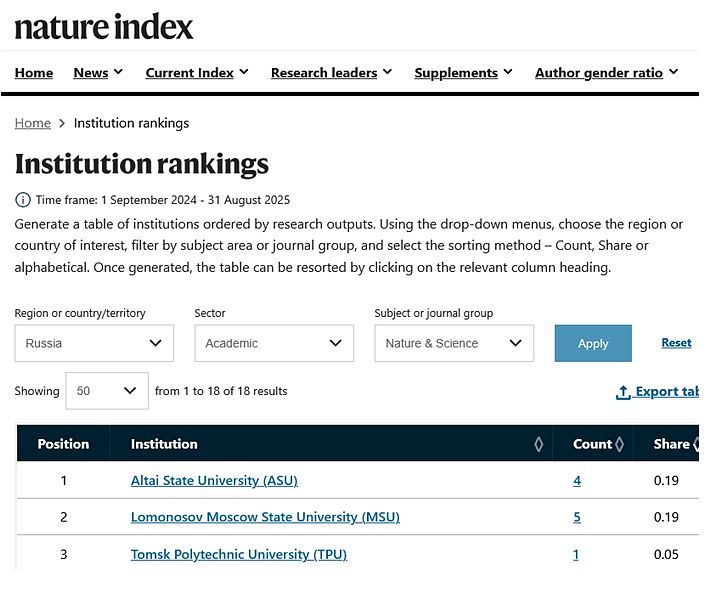 АлтГУ стал первым среди вузов России в рейтинге NATURE INDEX: NATURE&SCIENCE